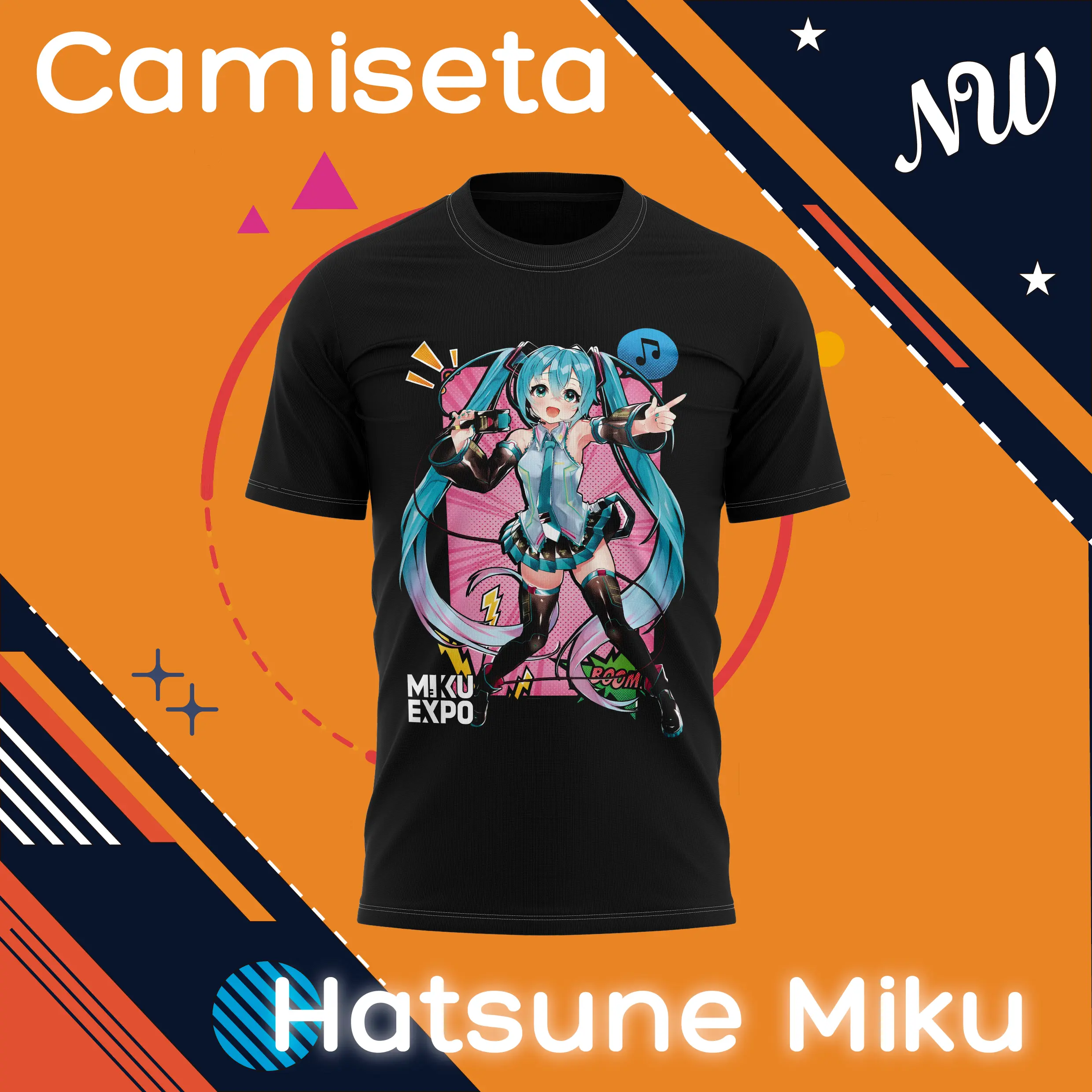 Esta camiseta exclusiva inspirada en la Miku Expo presenta a Miku en una pose dinámica sobre un fondo vibrante estilo cómic, ideal para los verdaderos fans del pop digital japonés.