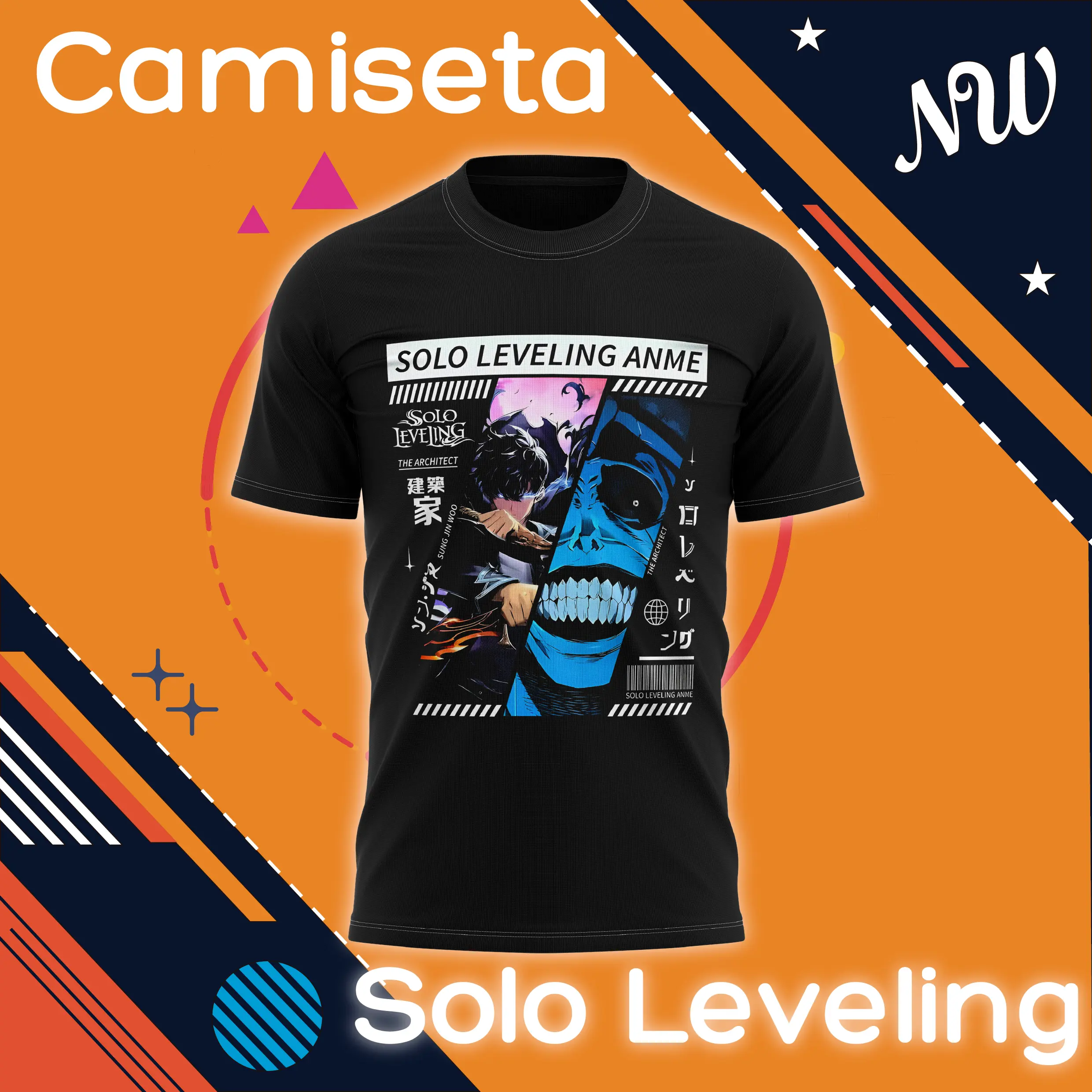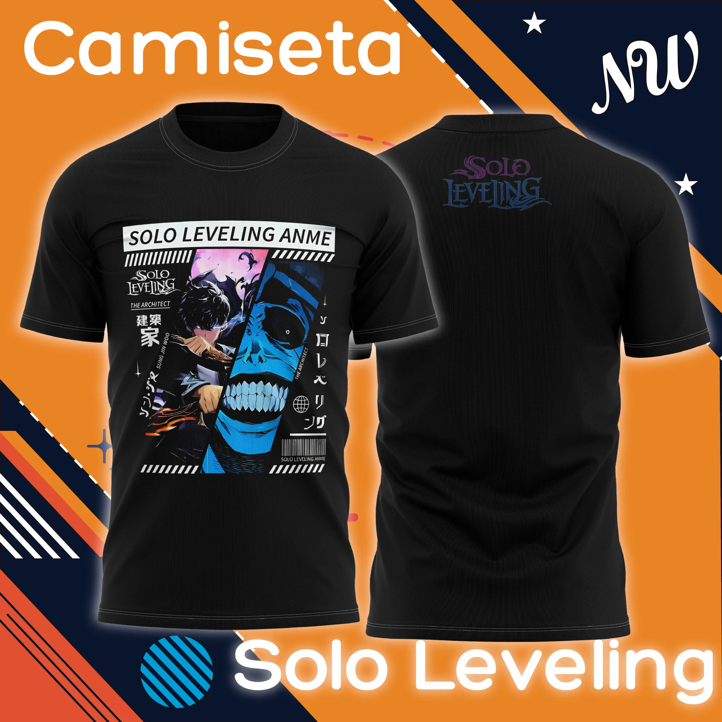 Esta camiseta de Solo Leveling presenta un poderoso diseño frontal con Sung Jin-Woo y “The Architect” en estilo póster, combinado con detalles en japonés que le dan un toque visual de alto impacto.