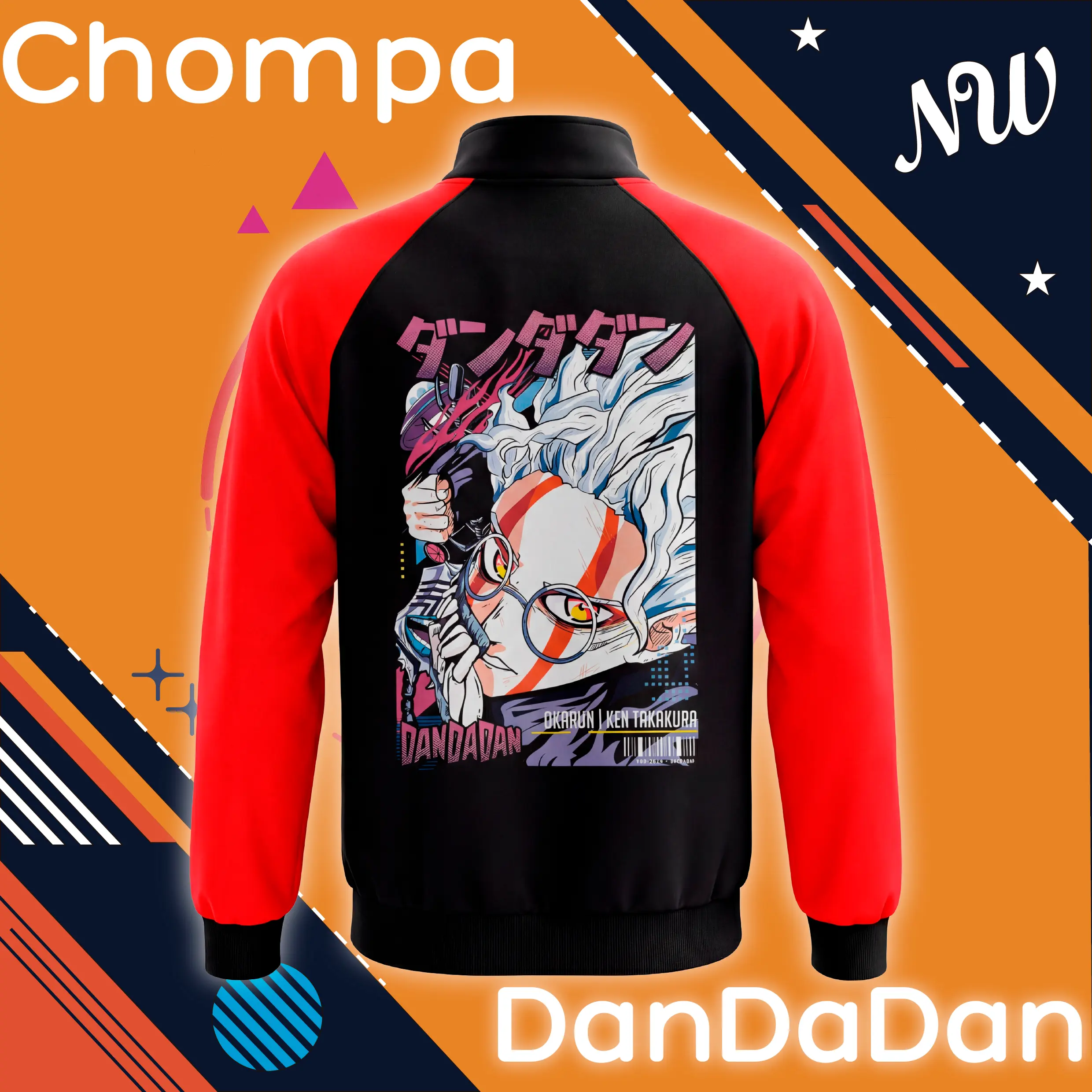 El diseño presenta mangas rojas temáticas, el logotipo de DanDaDan en el pecho y un estampado posterior con un arte ilustrado del personaje principal en estilo manga, con colores intensos y composición dinámica. Todo el estampado está realizado con tecnología DTF en alta definición, lo que garantiza gran nitidez y una larga vida útil.