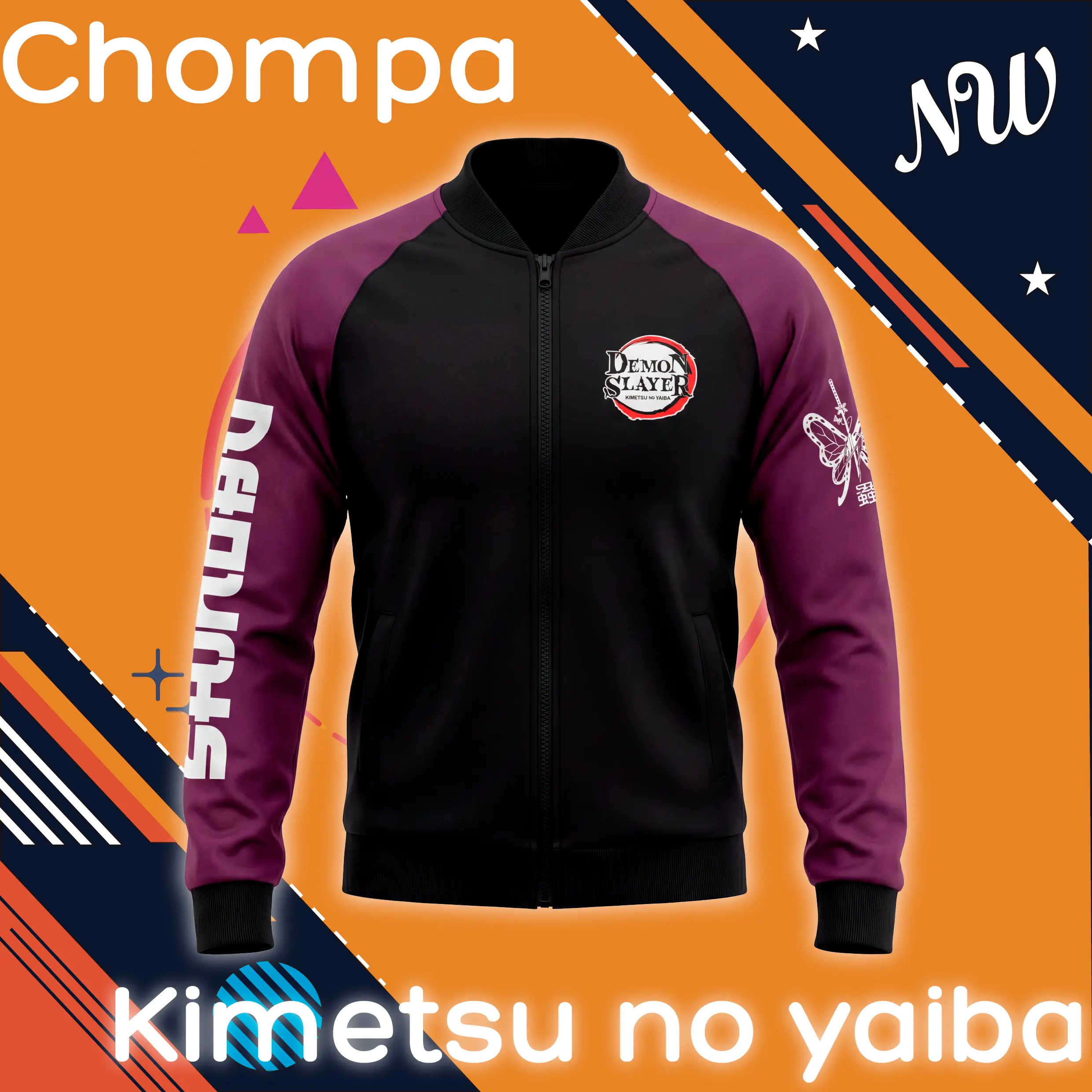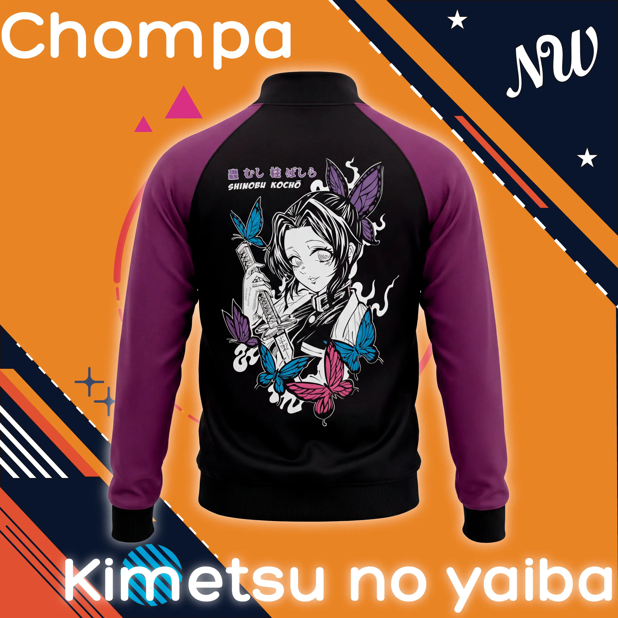El diseño destaca por sus mangas moradas, el emblema Demon Slayer al frente y una ilustración de Shinobu Kocho en la espalda, acompañada de mariposas de colores y detalles artísticos que representan su delicadeza y fuerza.