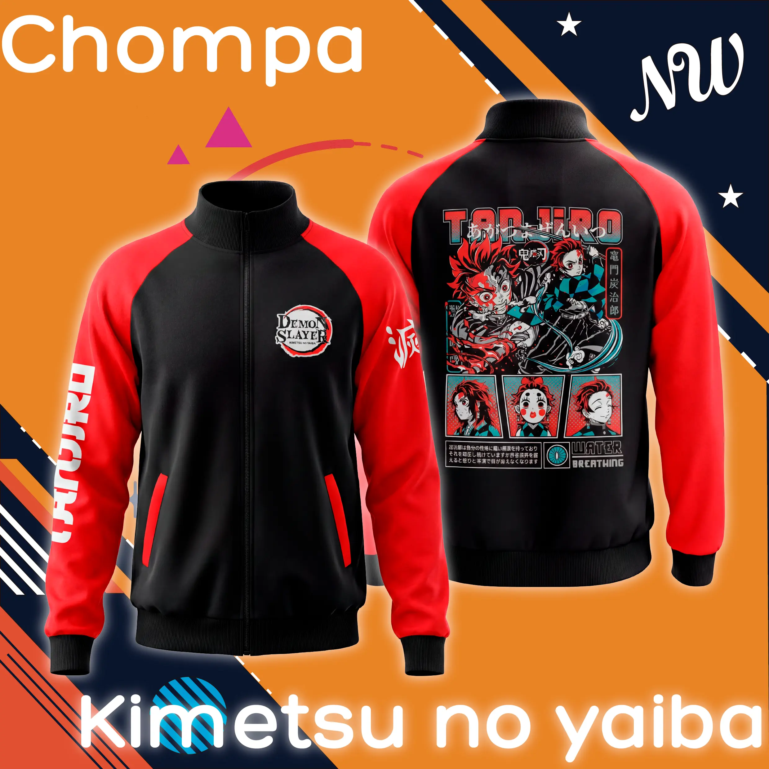El diseño presenta mangas rojas vibrantes, el emblema Demon Slayer en el pecho y una impresionante ilustración de Tanjiro en la espalda con detalles estilo manga y elementos de su técnica Water Breathing. El estampado está realizado con DTF, garantizando colores intensos, durabilidad y alta definición.