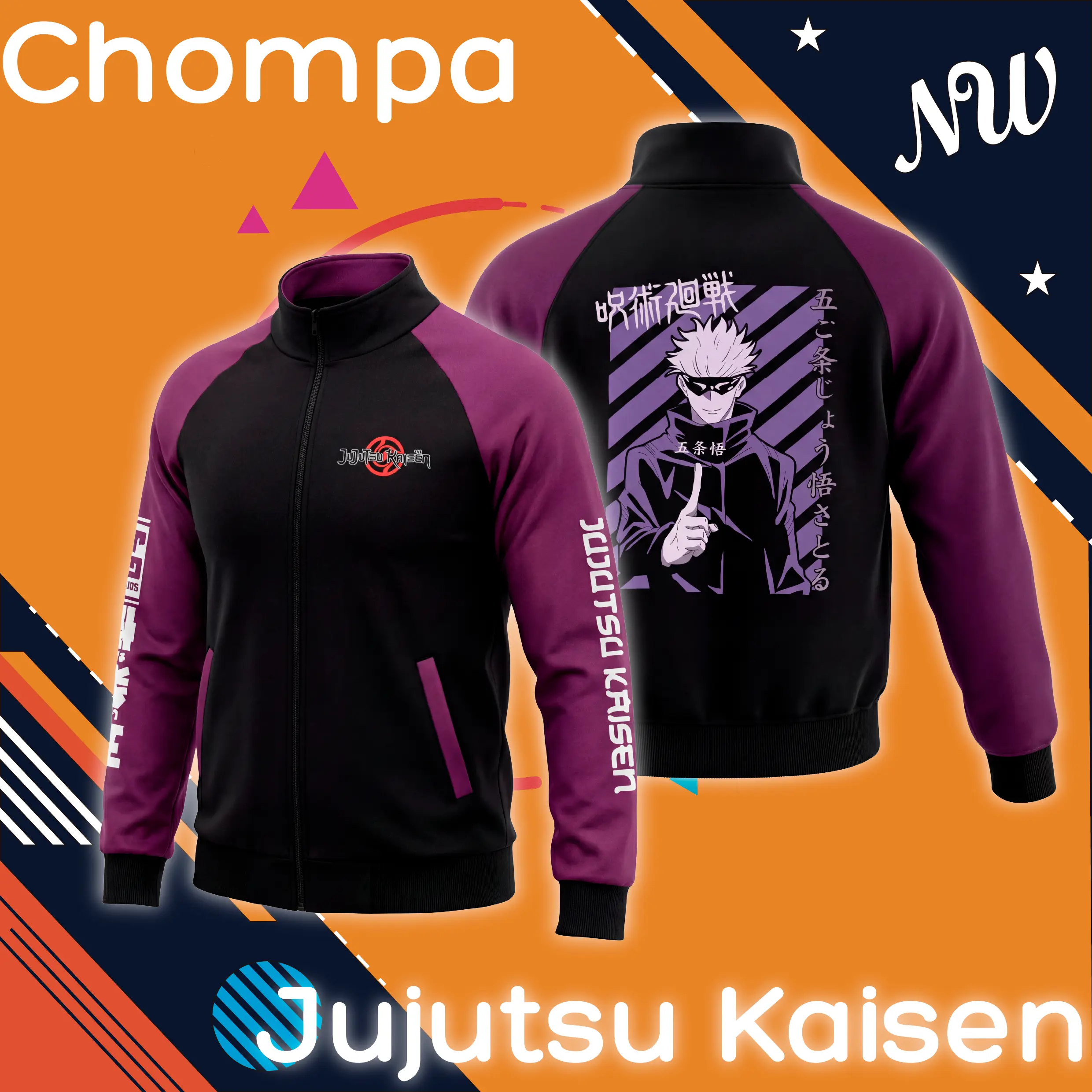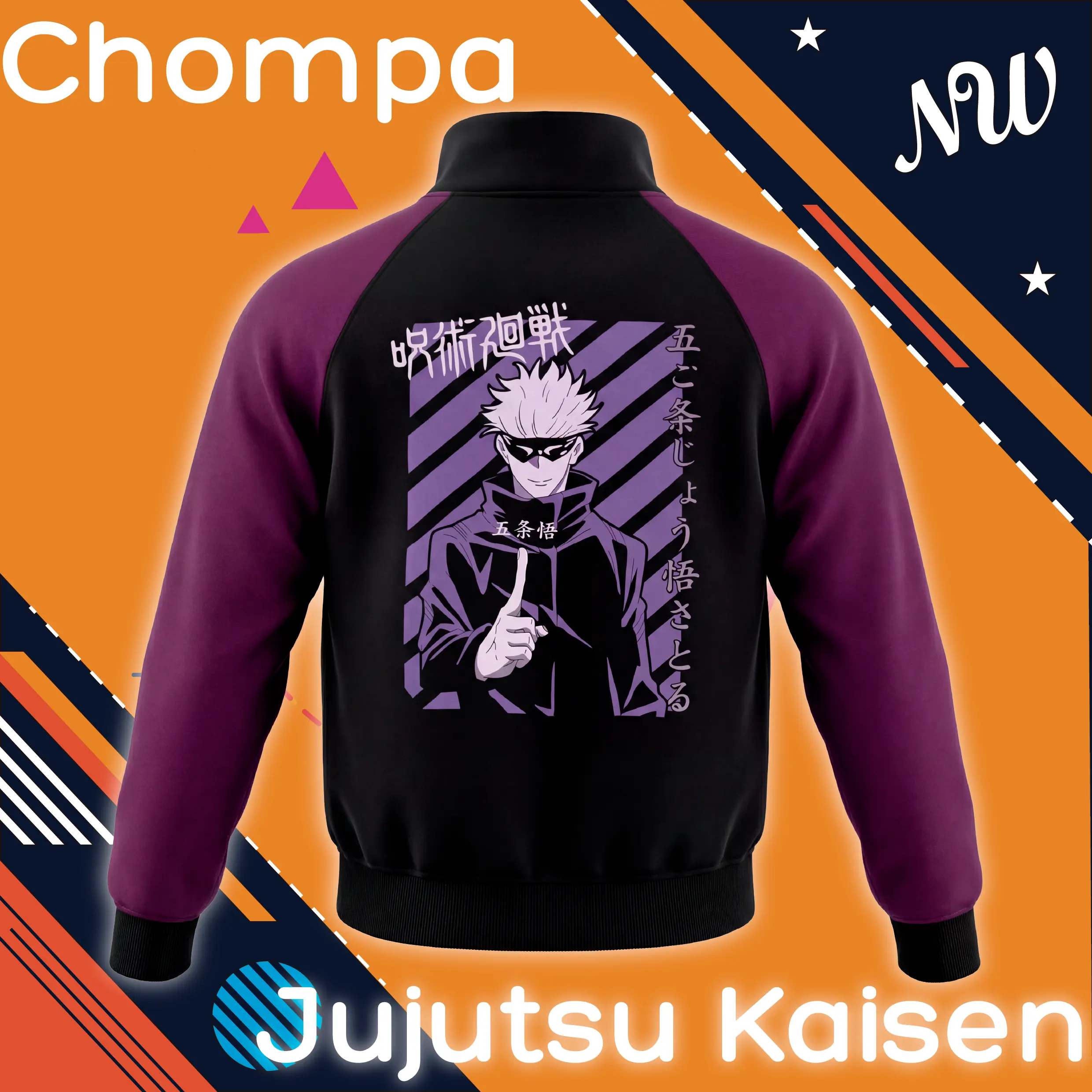 Domina el estilo del Hechicero Más Fuerte con esta chompa de Satoru Gojo – Modelo 02, inspirada en Jujutsu Kaisen. Incluye un diseño DTF de alta definición en la espalda y mangas en tono morado oscuro que resaltan el arte del personaje.